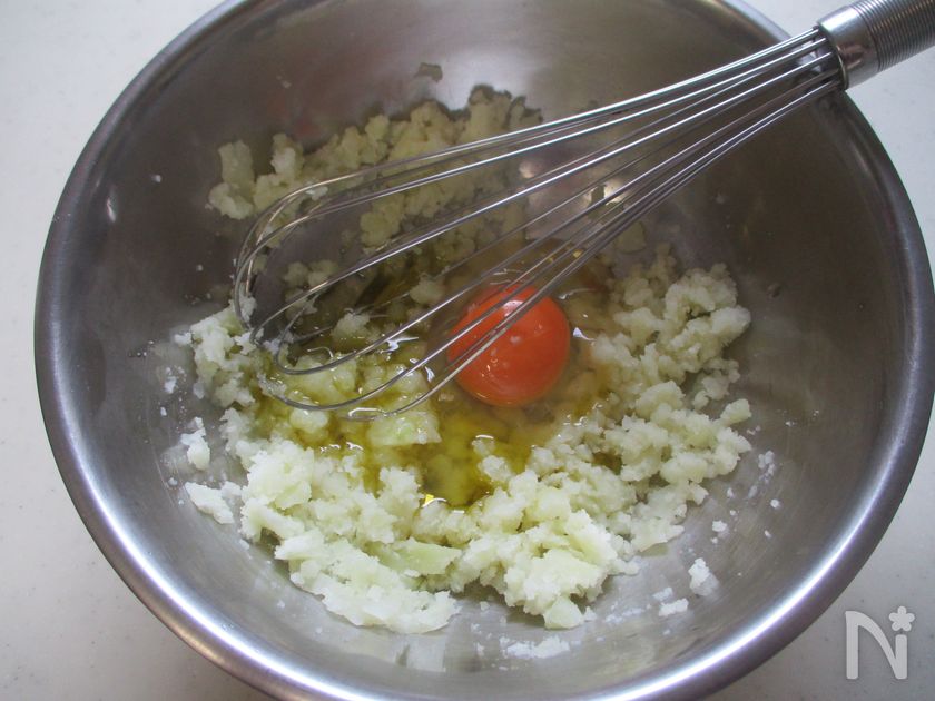 (1) じゃが芋をマッシュしたら【A】を加えてよく混ぜる。