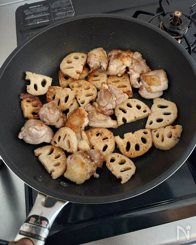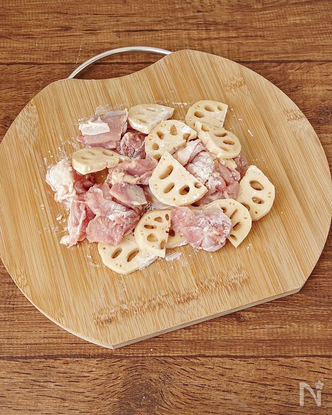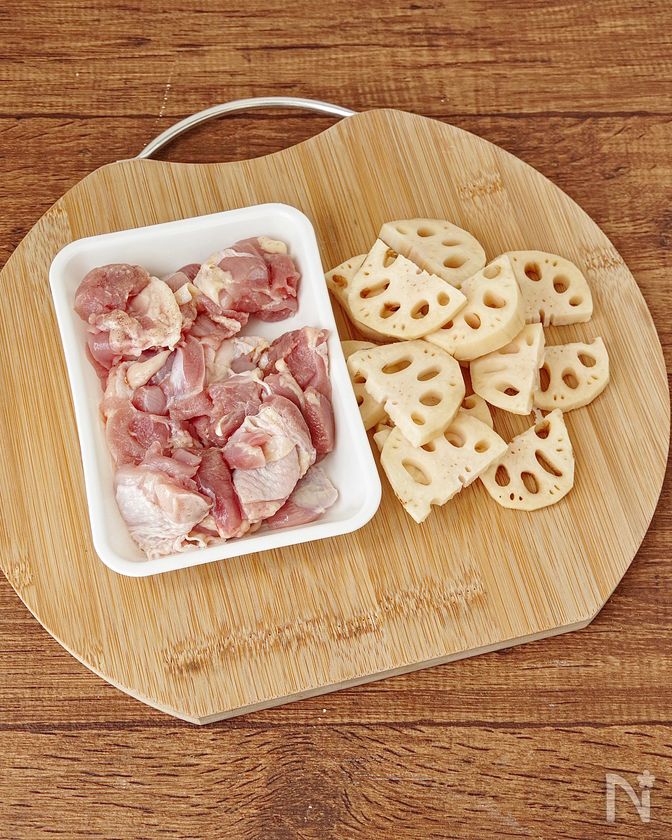 (1) 鶏もも肉は一口大に切り、塩こしょうを振る。れんこんは5mm幅の半月切りにする。