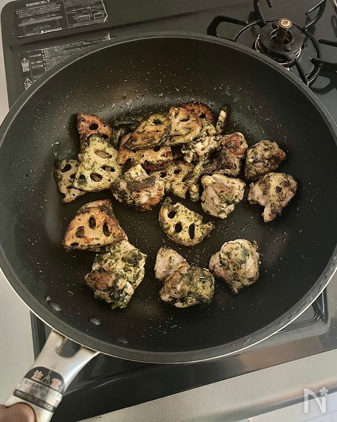 【れんこんとチキンののり塩マヨ炒め】パパッと簡単!