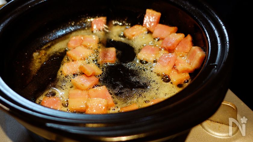(3) 土鍋にオリーブ油、バター、ベーコンを入れ中火にかける。バターを溶かしながら、ベーコンにかるく焼き目をつける。