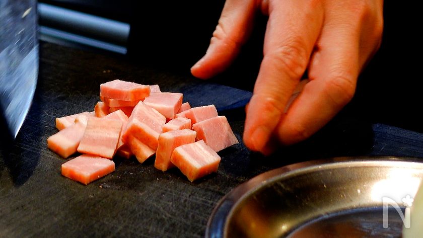 工程4)ベーコンのうまみとバターを米に絡めるイメージです。