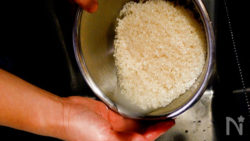 (4) 米を加え、ヘラで混ぜわせる。【A】を加え混ぜ、平らにならす。
