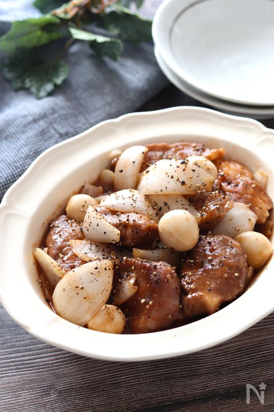 (8) 玉ねぎを崩しながら混ぜ、器に盛り付ける。仕上げに粗挽き黒こしょうをふる。