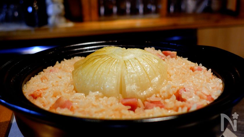 (5) 玉ねぎを真ん中にかるく押し込むように入れる。蓋をして蒸気が出るまで炊く。