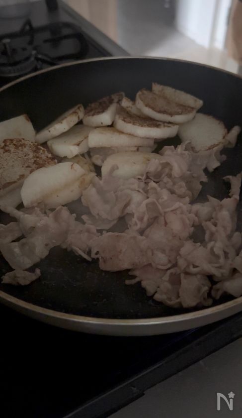 (1) フライパンに油をひき、長芋を並べて弱めの中火で焼く。焼き色がついたら裏返し、豚バラ肉を加える。