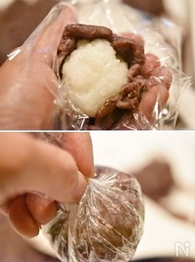 ⑦をのせて包み込み形を整える。あんこは約40gです。