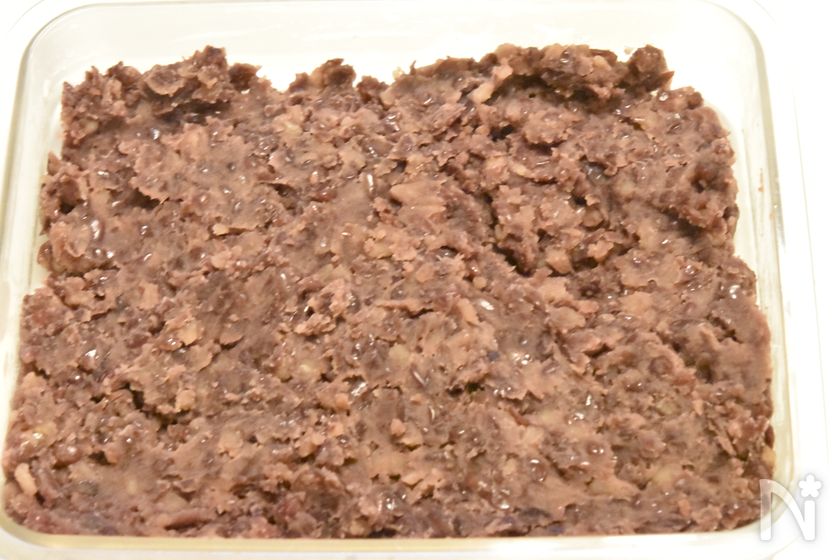 (8) ラップの上にあんこを平らにして置き、