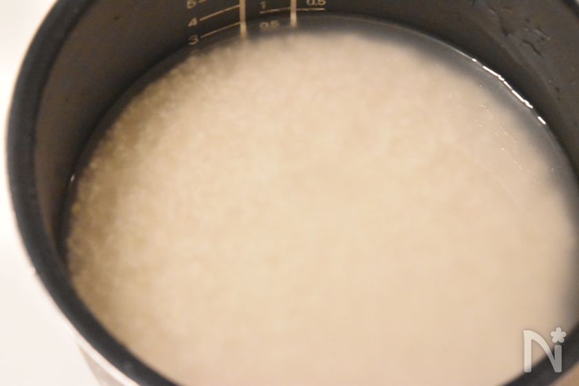 3メモリまで水を入れ、30分浸水して炊飯する。