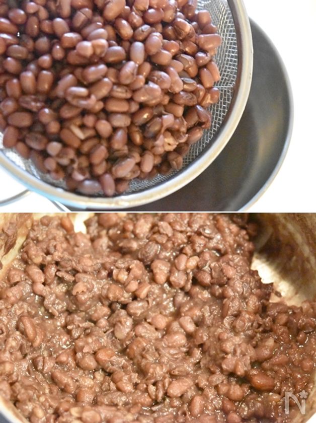 (4) ザルとボウルを重ね③をあけ鍋に小豆を戻し砂糖と煮汁(100cc)を加え、ヘラで優しく混ぜながらとろみがつくまで煮詰める。