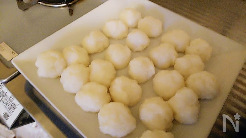 (7) 手に水をつけながら⑥を約25gに丸める。使い捨て手袋を使うと、調理がスムーズに進み衛生的にも良くなります。