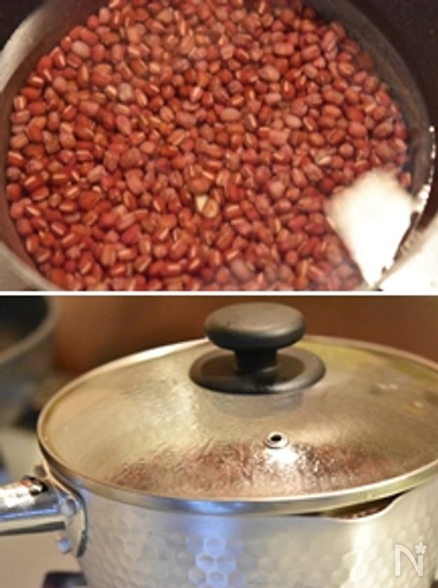 (2) 小豆は流水でやさしく洗い、鍋にかぶるぐらいの水と一緒に入れ中火にかけ、沸騰したら200ccの差し水をする。