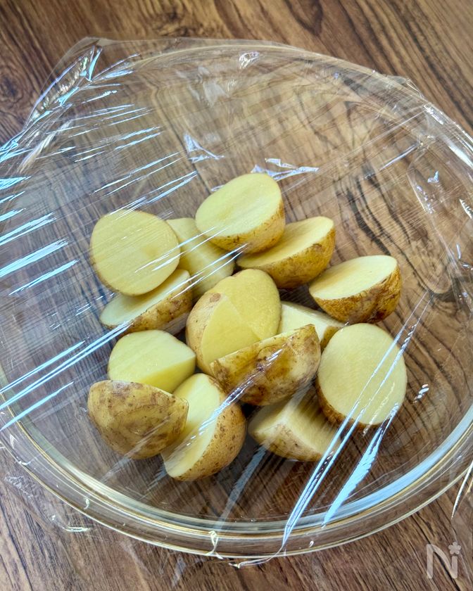 ・新じゃがいもは、普通のじゃがいもでも代用可能です。皮をむいて使用し、レンジ加熱を1〜2分延ばしてください。