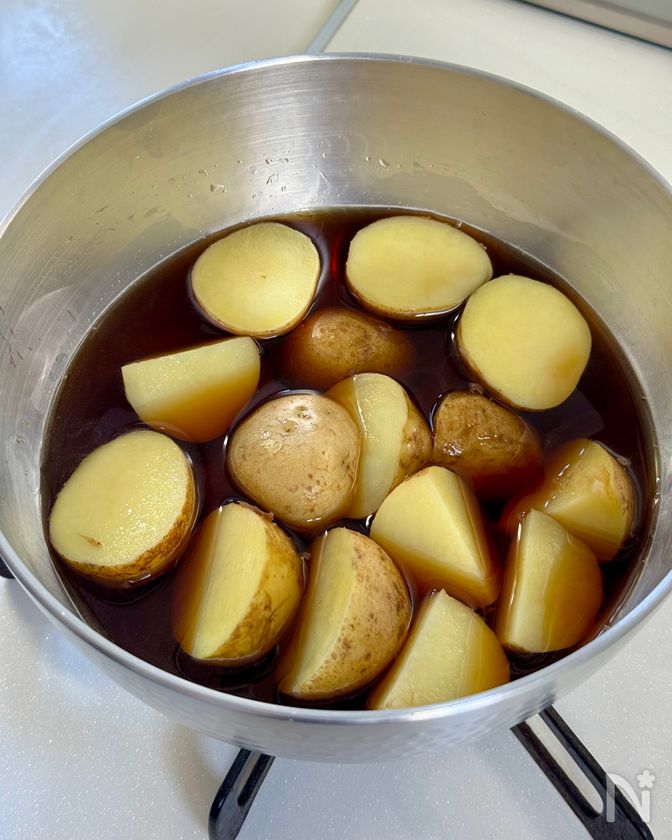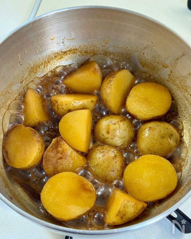 (1) 小鍋に【A】を入れて中火にかけ、煮立ったら新じゃがいもを加える。