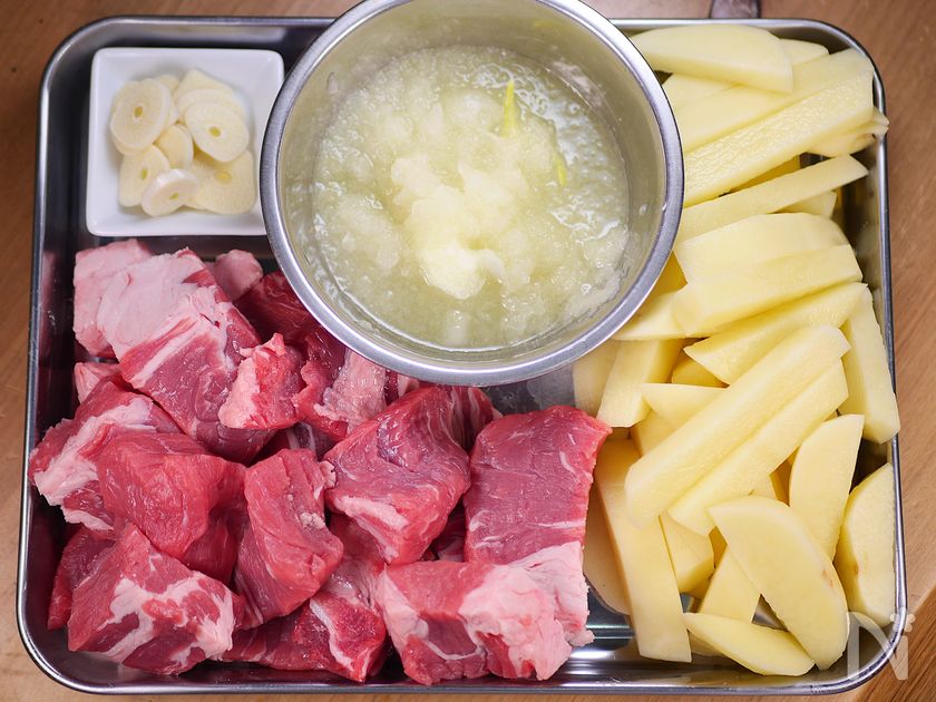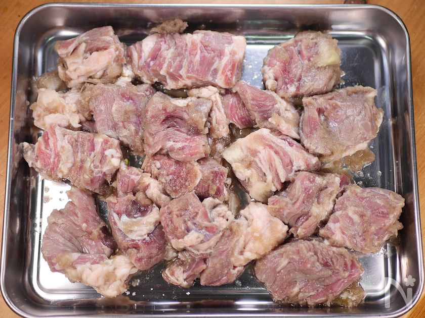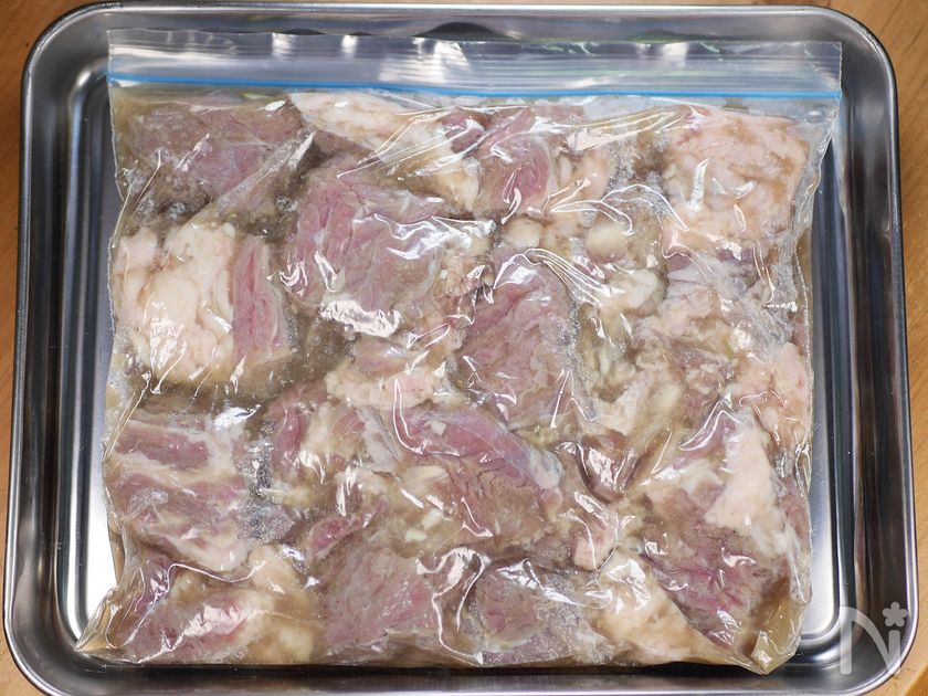 ポリ袋に牛肉と玉ねぎのすりおろしを入れ、揉み込んで2~3時間漬け、玉ねぎの酵素で肉の繊維をやわらかくする。