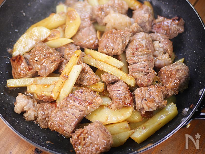 (1) ○牛肉ステーキ用は厚めの一口大に切り分ける。