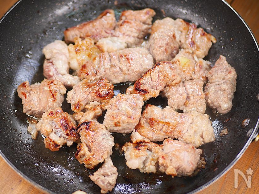 ○フライパンを強火で熱したら、牛肉を入れて片面3~4分焼き、焼き色をしっかりと付ける。