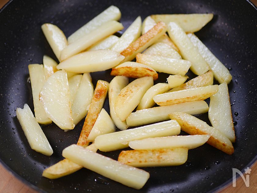 (4) ○フライパンにサラダ油(大さじ1、分量外)とじゃがいもに塩ひとつまみをふり、強火で1分炒めて油を回す。