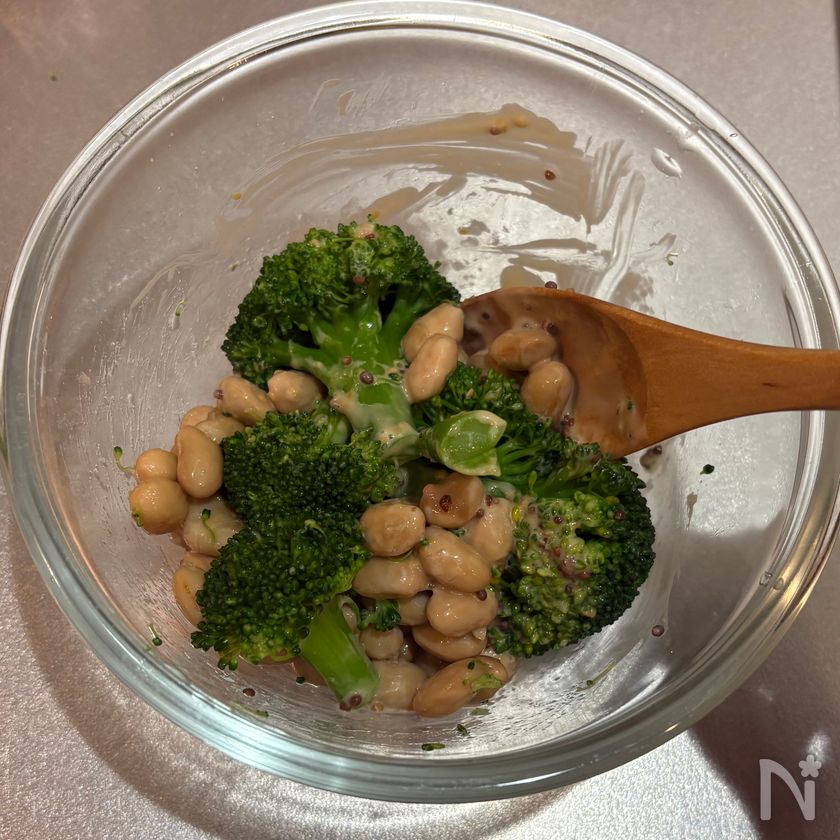 (1) ボウルに蒸し大豆とブロッコリーを入れたら【A】を半量加え混ぜ合わせる。