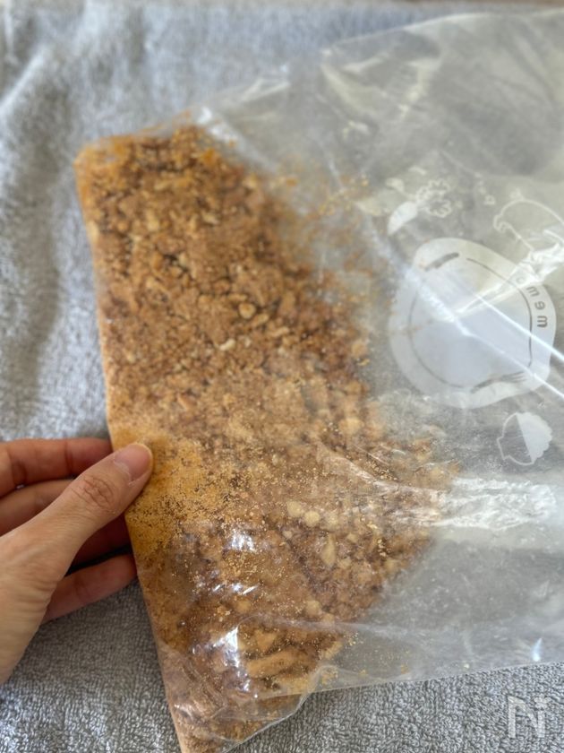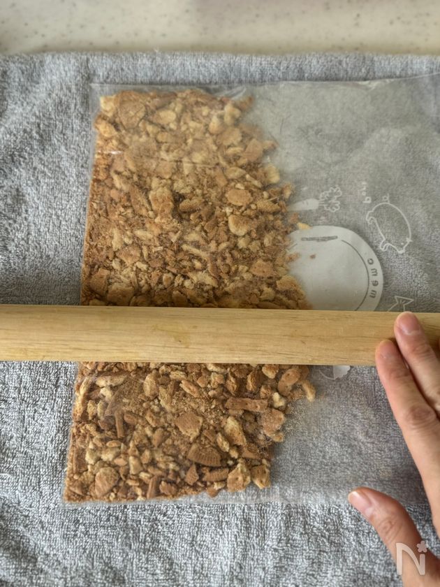 (2) ビスケット(プレーンタイプ)はジッパー付き保存袋に入れ、めん棒でたたいて細かくする。