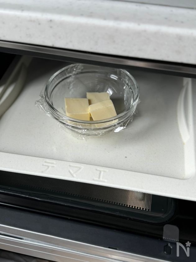 (1) バター(食塩不使用)は2〜3cm角に切り、耐熱容器に入れてラップをかける。レンジ手動(200W)で2分加熱し溶かす。