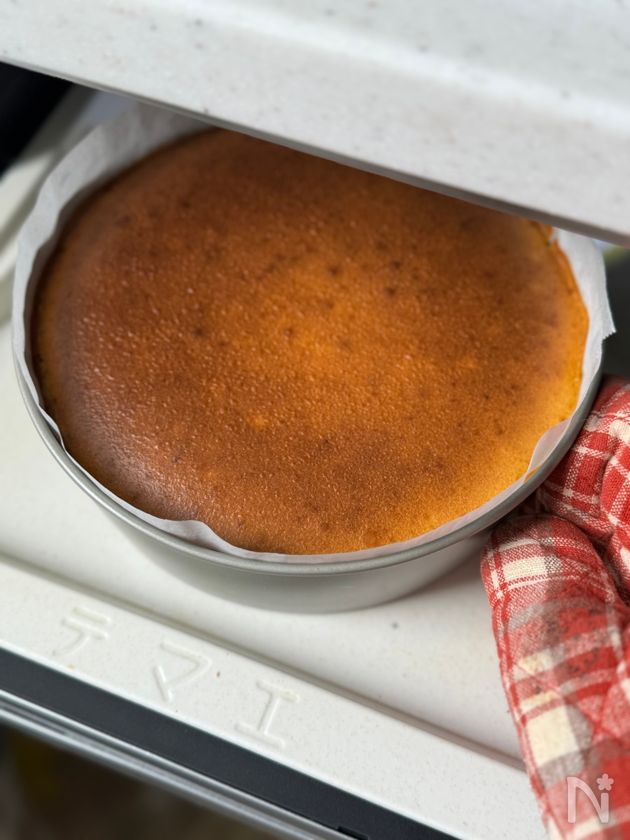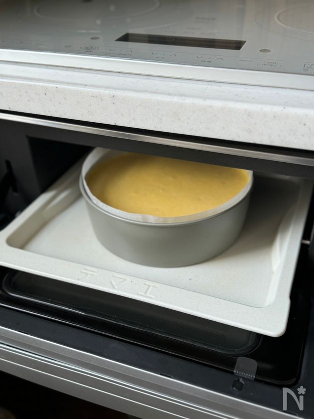 (9) 4の型に流し入れたら受け皿にのせ、レンジグリルに入れ、オーブン<150℃>で40〜45分焼く。(焼き始めて30分頃に様子を見てアルミホイルをかぶせる)