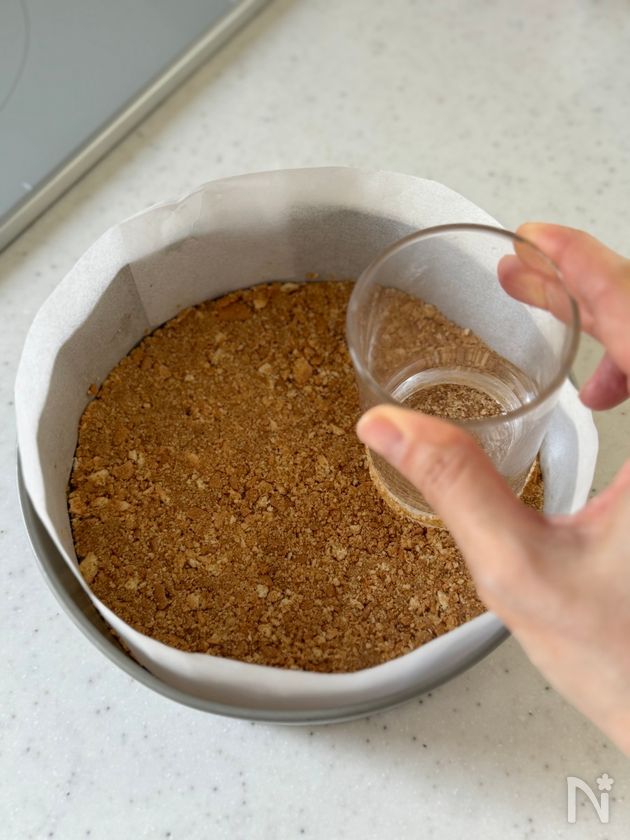 (4) 3を型に敷き詰め、小瓶などを使って平らに押しつける。