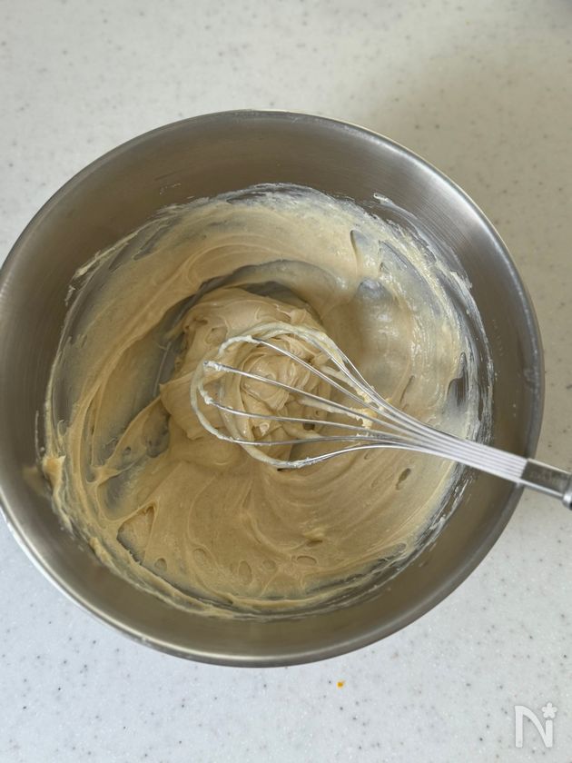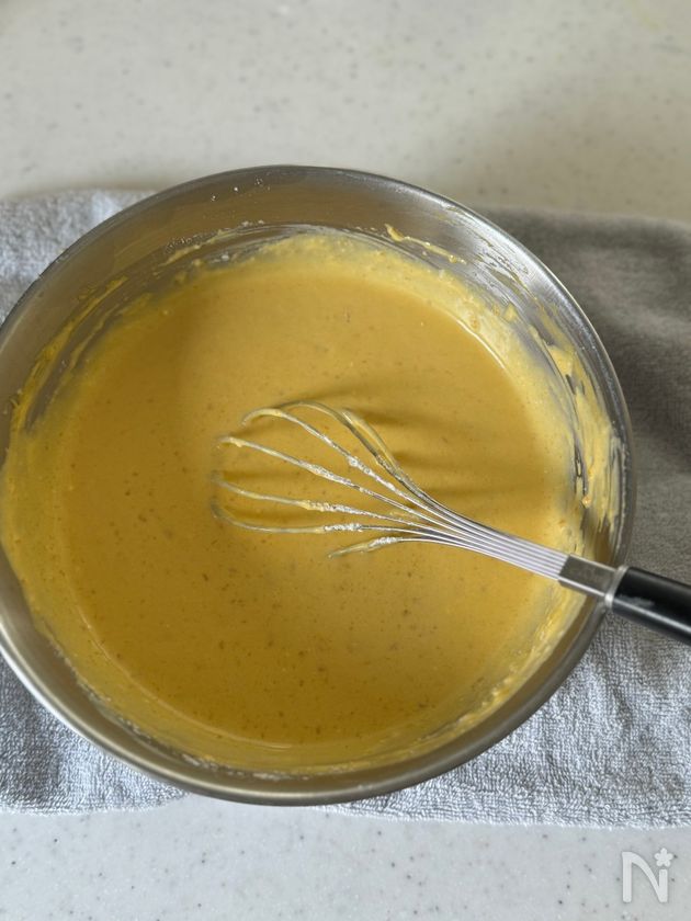 (8) さらに6のかぼちゃ、【A】を順に加えてその都度粉っぽさがなくなるまで混ぜ合わせる。