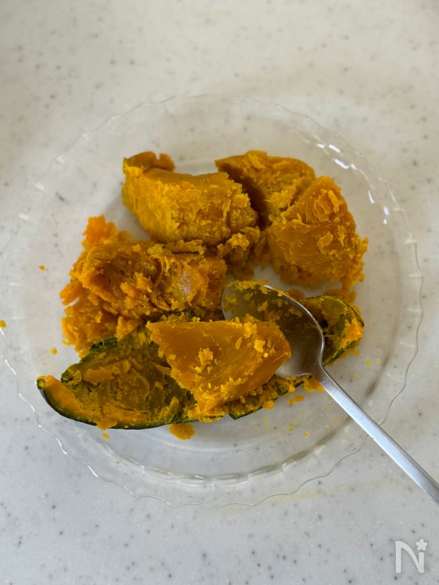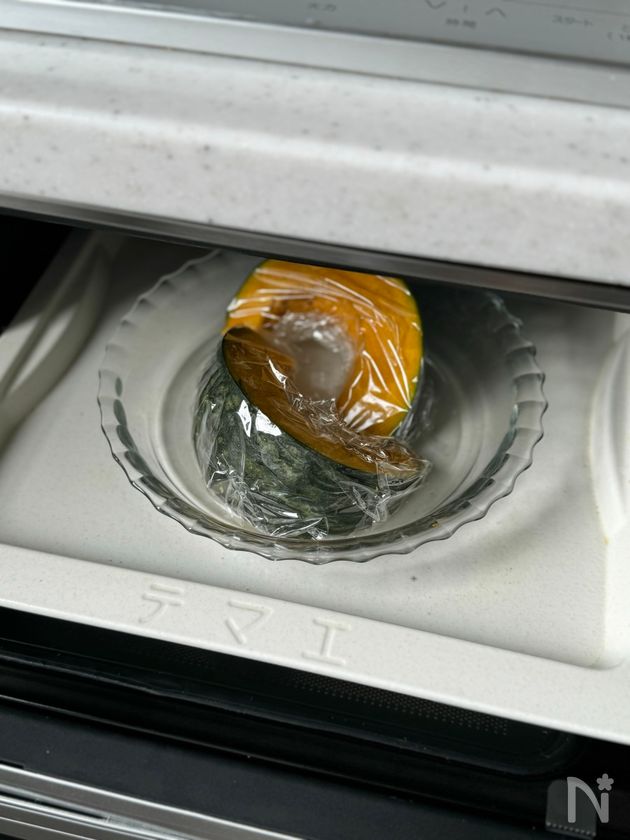(5) かぼちゃは種とワタを除き、半分に切ってラップで包む。耐熱皿にのせてレンジ手動<500W>で5分加熱し、裏返してさらに1分加熱する。