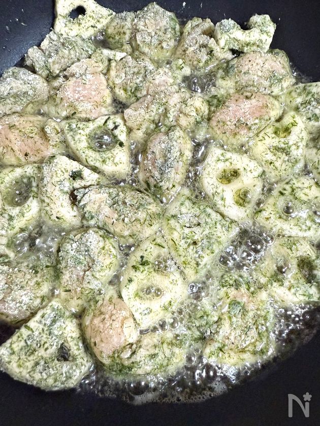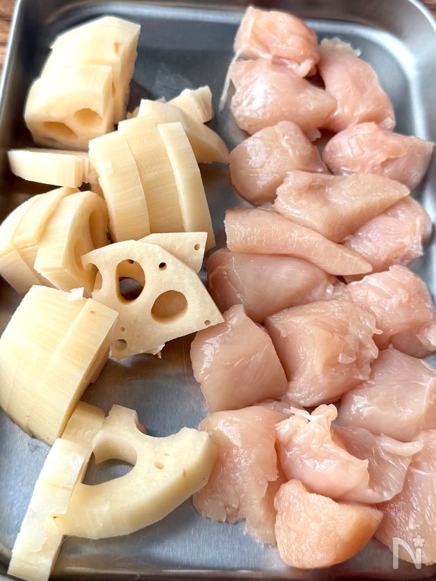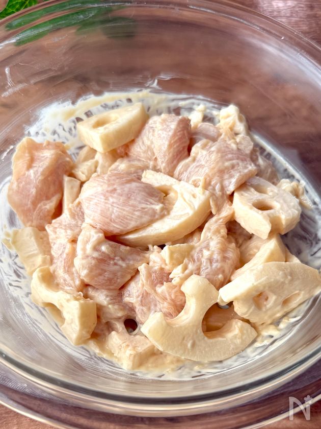(1) レンコンは皮をむき、1㎝厚さのいちょう切りにする。水にさらして、水気をしっかりきる。鶏ささみは筋を切り、4〜5等分する。