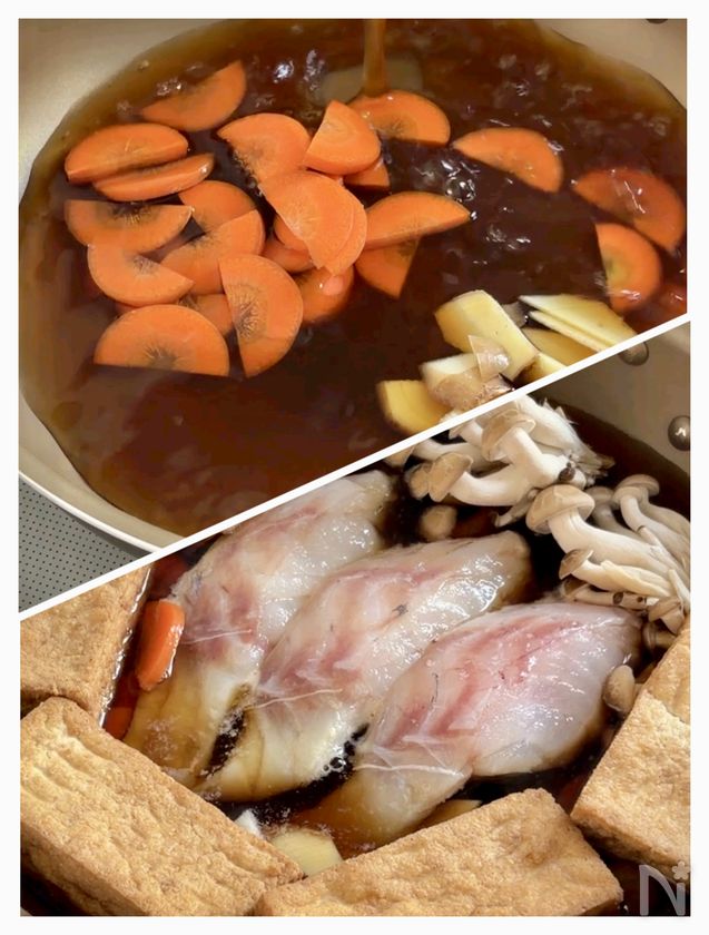 (2) 生姜は薄切り、人参は0.5mm幅の半月切り、しめじは食べやすい大きさにほぐす。フライパンに【A】、生姜、人参を入れて強火で加熱し、沸騰したら中火で3分煮る。