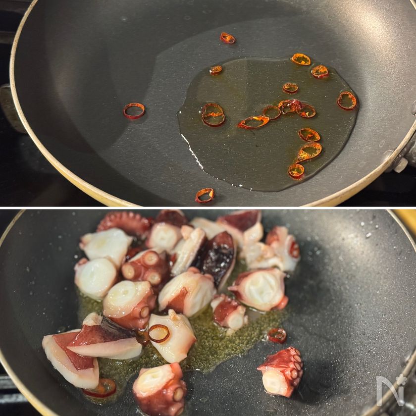 (1) フライパンに【A】を入れて中火で熱し、香りが立ったら茹でタコを加えて炒める。