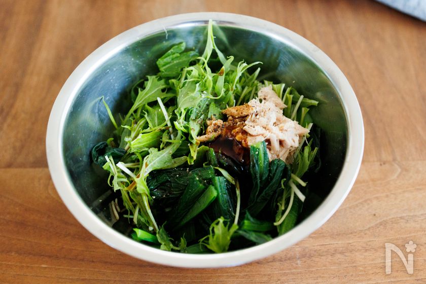 (2) ボウルに小松菜と水菜、ツナ、【A】を加えてよく和える。