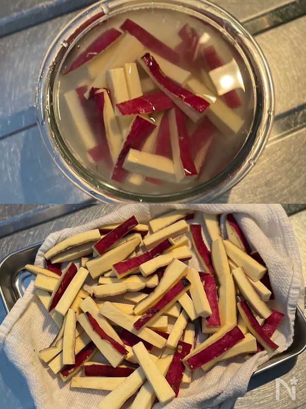 (1) さつまいもは皮付きのまま1cm角のスティック状に切り、水に5分さらして水気を拭く。