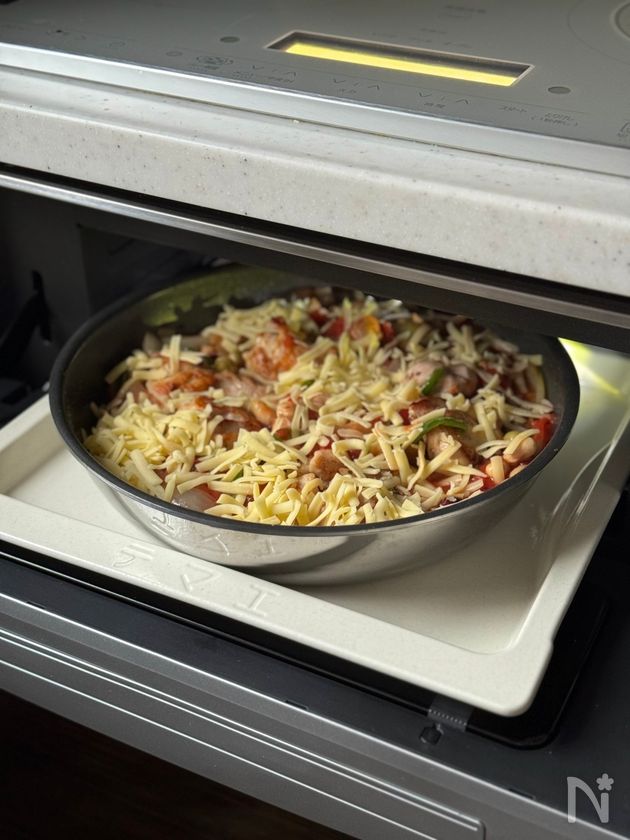 (6) 受け皿にフライパンごとのせてレンジグリルに入れ、[グリル]7~8分に設定して加熱する。