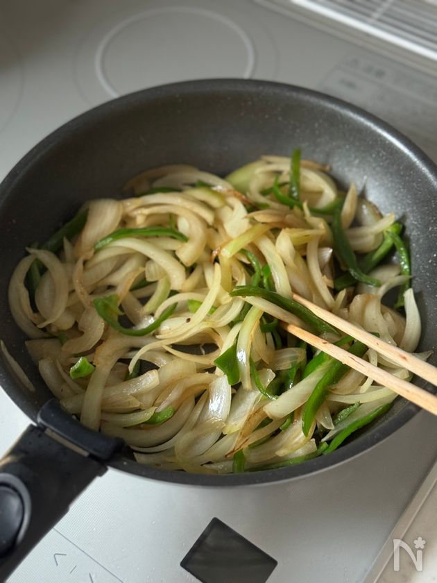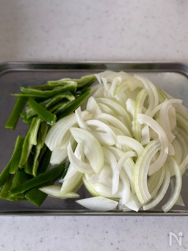 (2) 玉ねぎは薄切りにする。ピーマンは縦半分に切ってへたと種を除いて細切りにする。