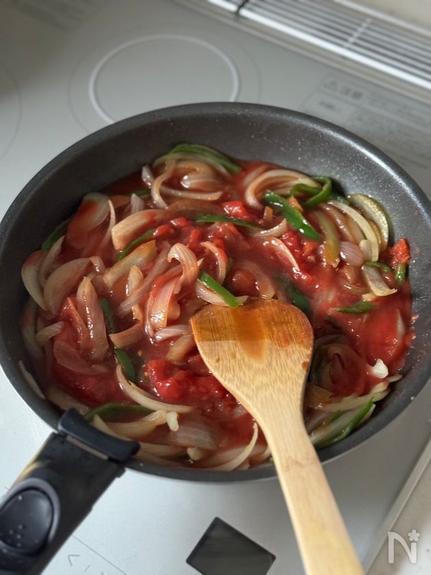 (5) ホールトマト缶を加えてトマトの実を崩したら、【B】、ミックスビーンズ缶、3の鶏肉を加えて混ぜる。中火(IHヒーター火力ランプ[4])で3~4分煮込んだら、ピザ用チーズを散らす。