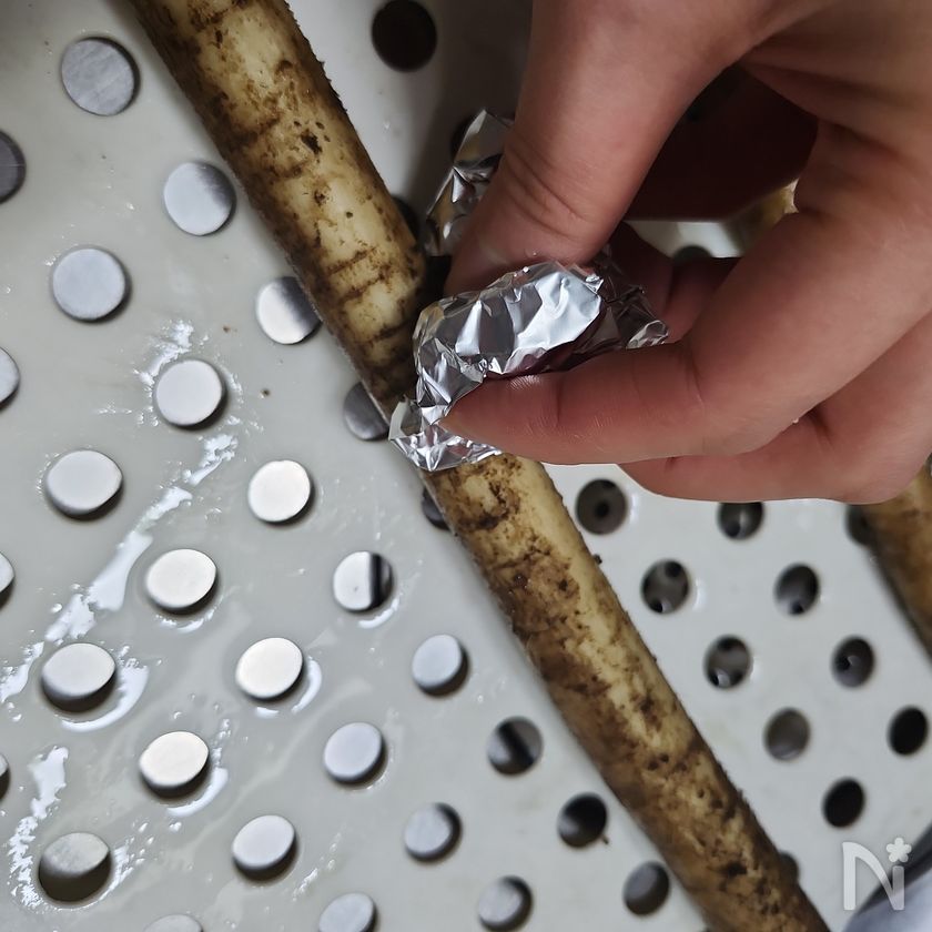 (下準備) ごぼうはアルミホイルを丸めたもので軽くこすり、皮をこそげる。