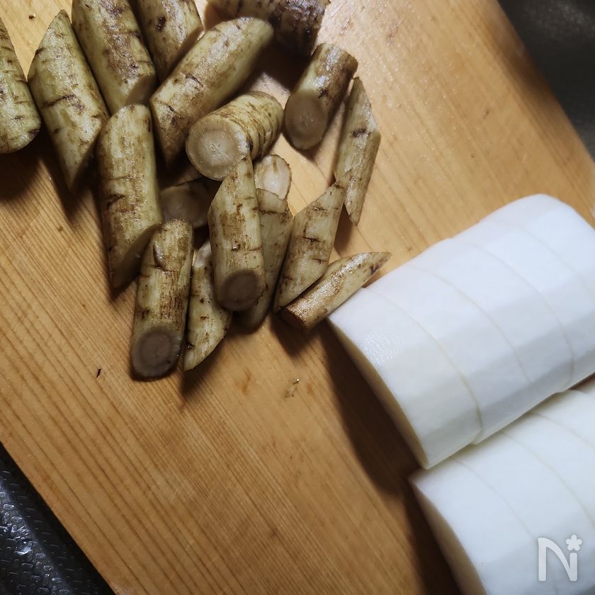 大根は皮をむき、厚さ1.5cmの半月切りにする。
