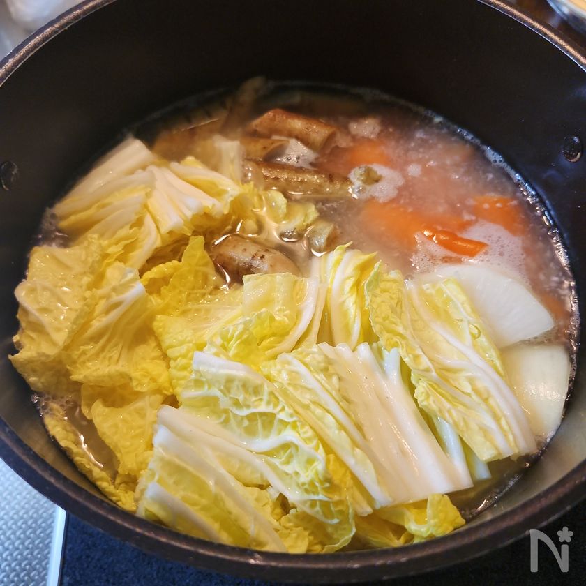 今回は簡単に作れるよう根菜と葉物(白菜)を同時に入れて煮込んでいます。一緒に煮込むと多少白菜が溶けてしまうので、気になる場合は初め根菜のみで煮込み、15分経ってから白菜を加えてください。