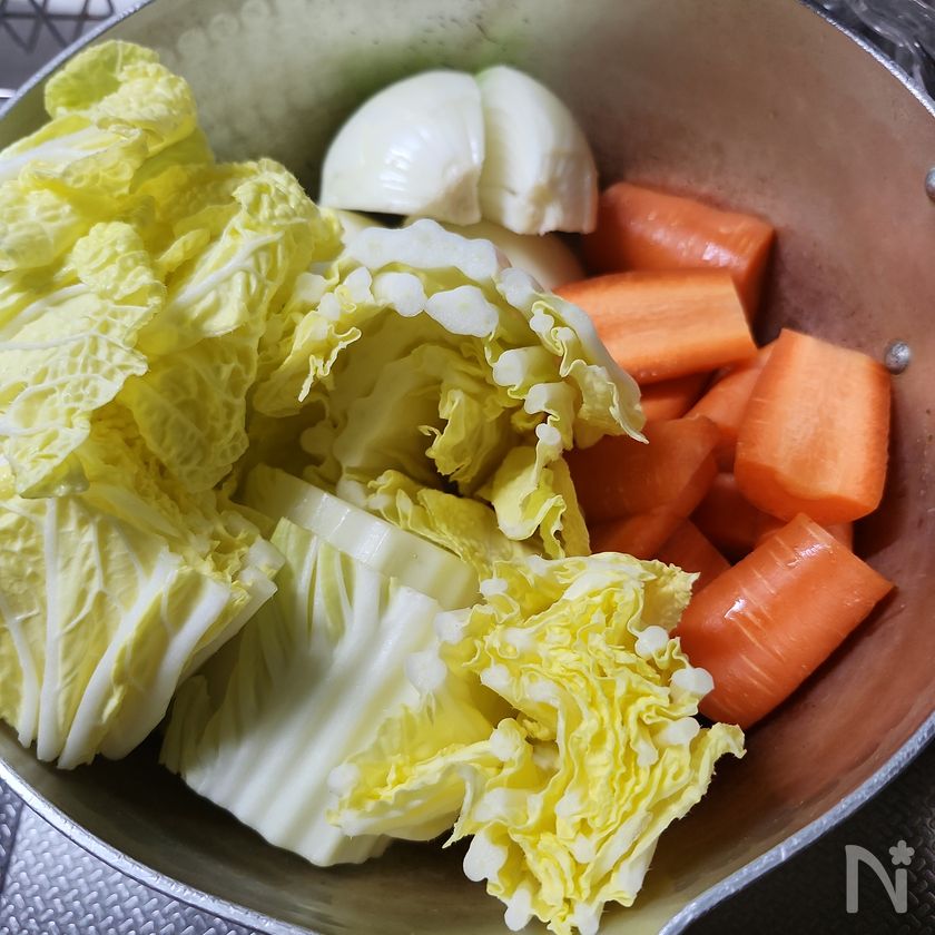 表面こんがり焼き色が付いたら、【A】と切った野菜を入れる(根菜は下、白菜が一番上になるように入れる)。