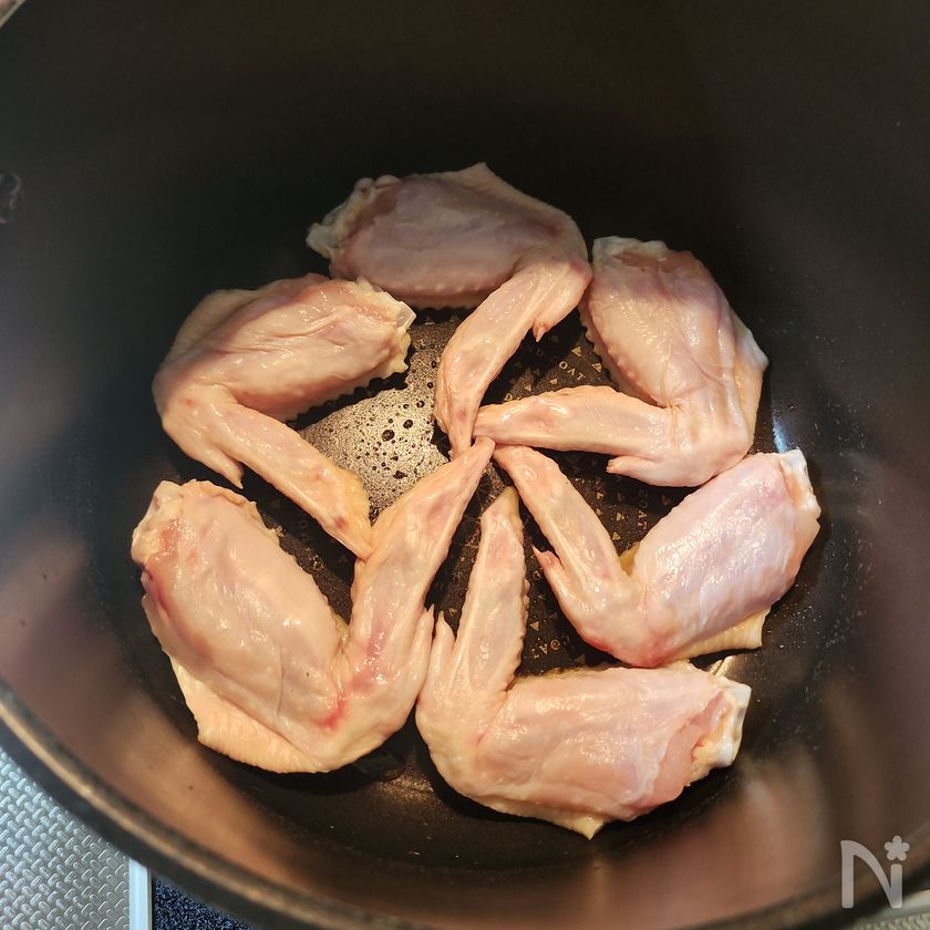 (3) 鍋にごま油を中火で熱し、鶏手羽先を皮目から焼く。