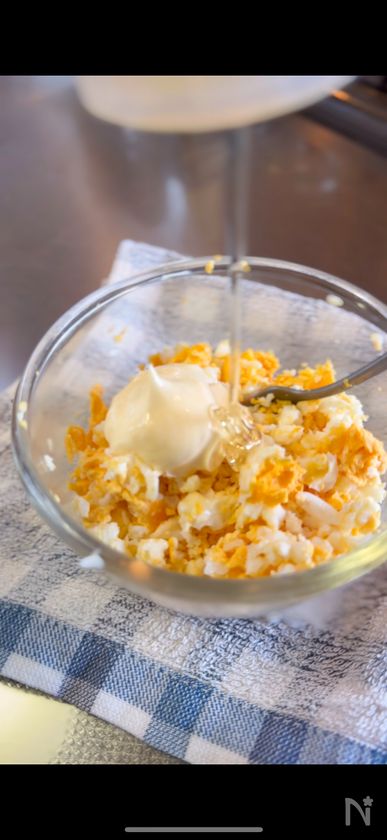(下準備) タルタルソースを作っておく。卵を耐熱容器に割り入れ、必ず黄身を崩す。レンジ600Wで1分半ほど加熱したらフォークで粗くつぶす。