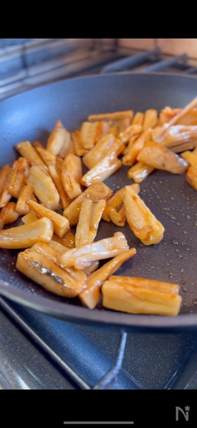 (2) 蓮根の水を切ったらフライパンで片栗粉をまぶす。油を入れて、こんがりするまで揚げ焼きしたら、余分な油を拭き取り、【A】を加え炒めて完成。