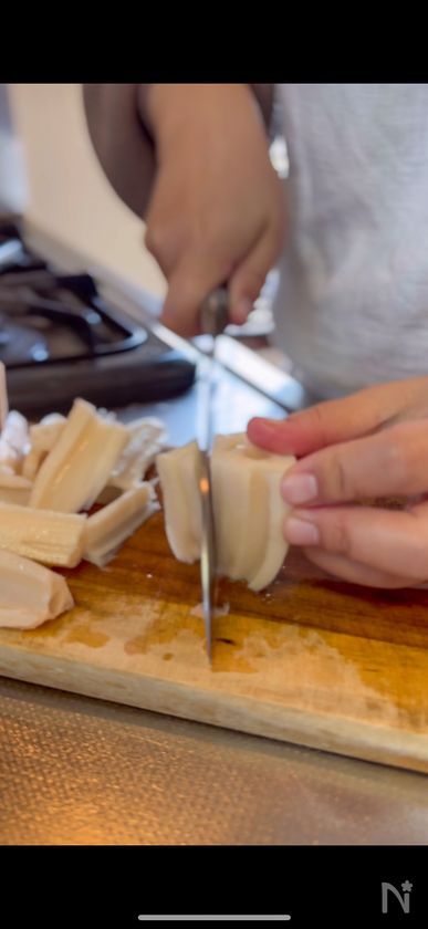 (1) 蓮根は縦にスティック状に切り水にくぐらせ、ザルにあげておく。