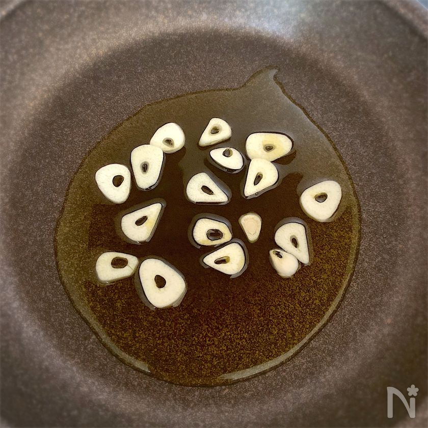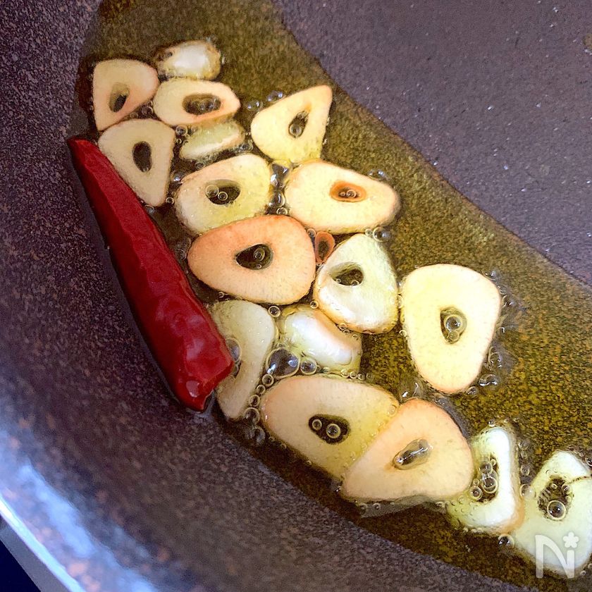 (1) フライパンにオリーブオイルとにんにくを入れ、弱火でにんにくがきつね色になるまでじっくり加熱する。
