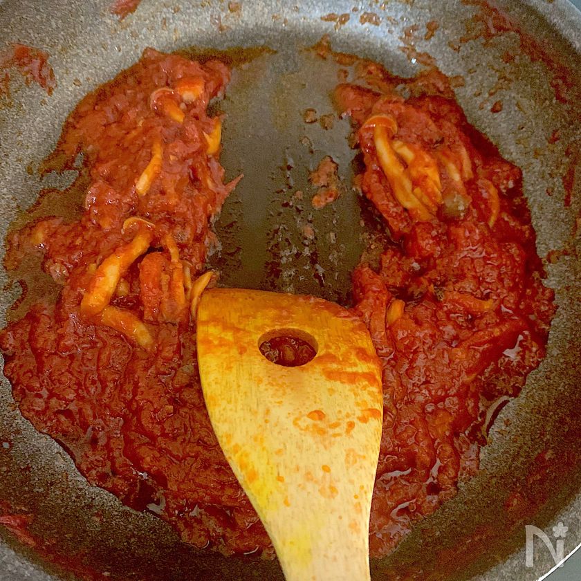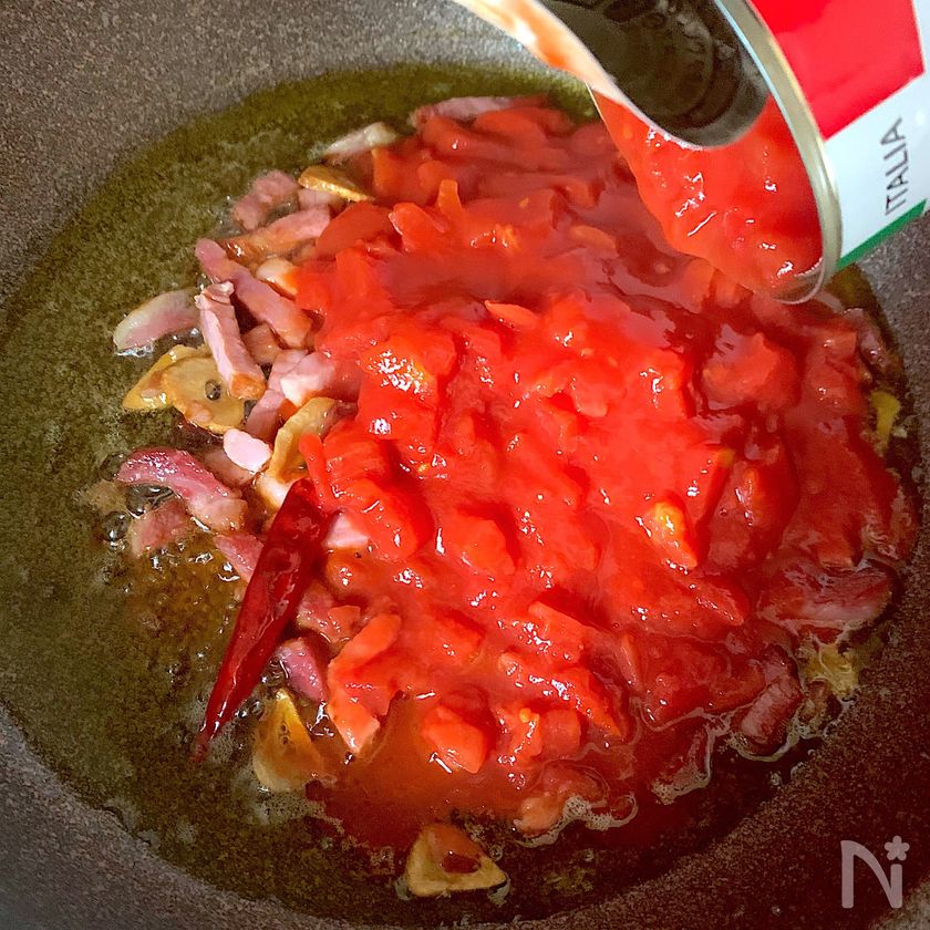 (3) ベーコンとしめじを加え、中火にして炒める。トマト缶を加え、沸騰したら弱火に下げて煮込む。