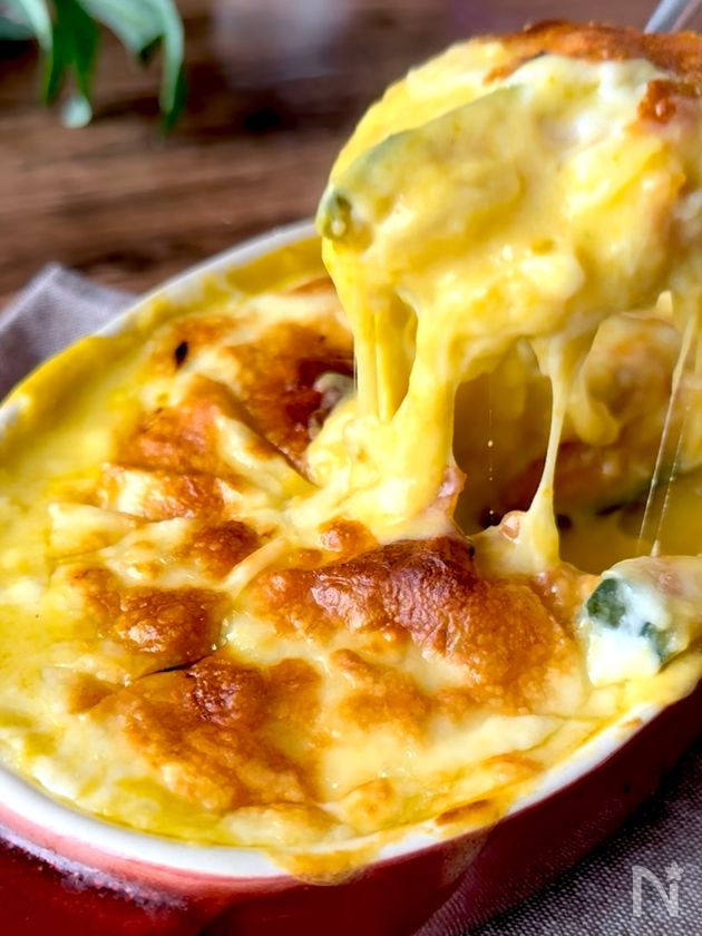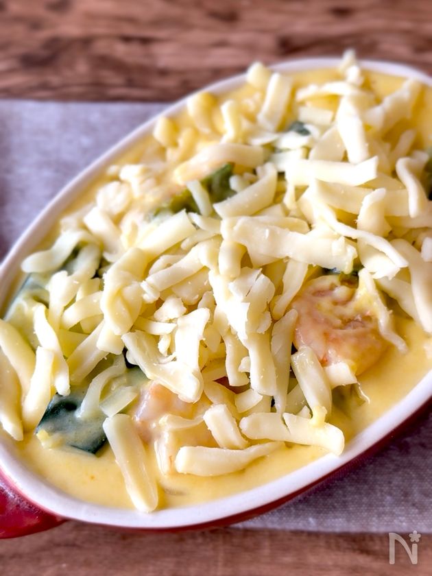 (7) よく混ぜてグラタン皿に流し入れ、ピザ用チーズをのせる。