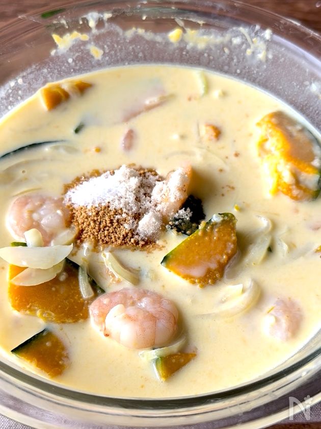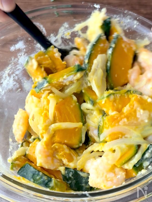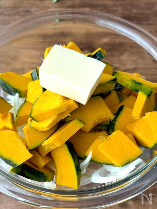 (3) ②に①を加え、バターをのせ、ふんわりラップをして600Wで約6分、かぼちゃがやわらかくなるまで加熱する。