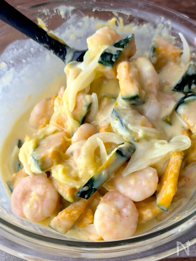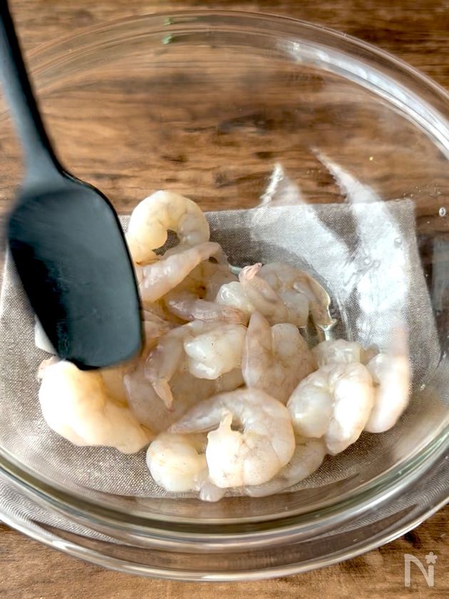 (2) 耐熱ボウルにむきえびを入れ、【A】で下味をつける。
