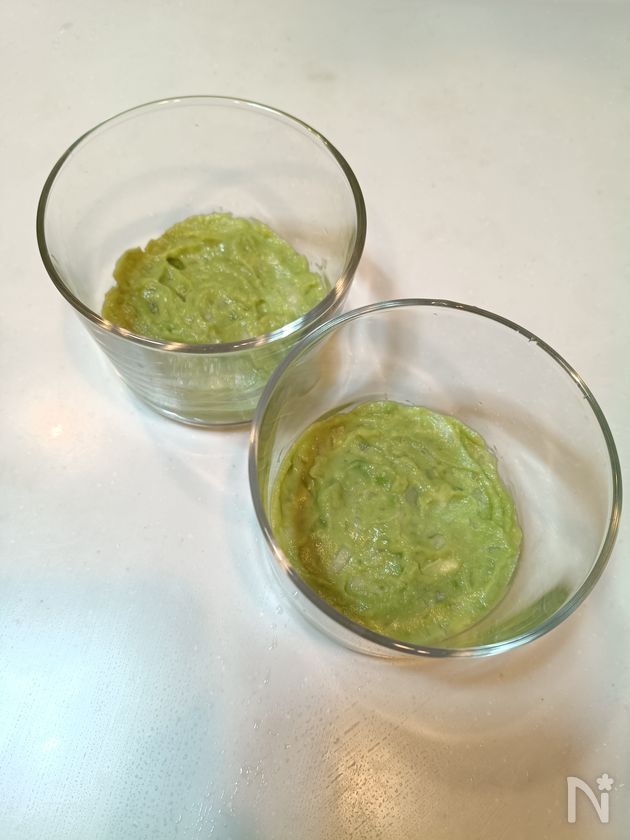 (2) アボカドは半分に切り、種を除き、スプーンで実をくり抜く。マッシャーで潰す。